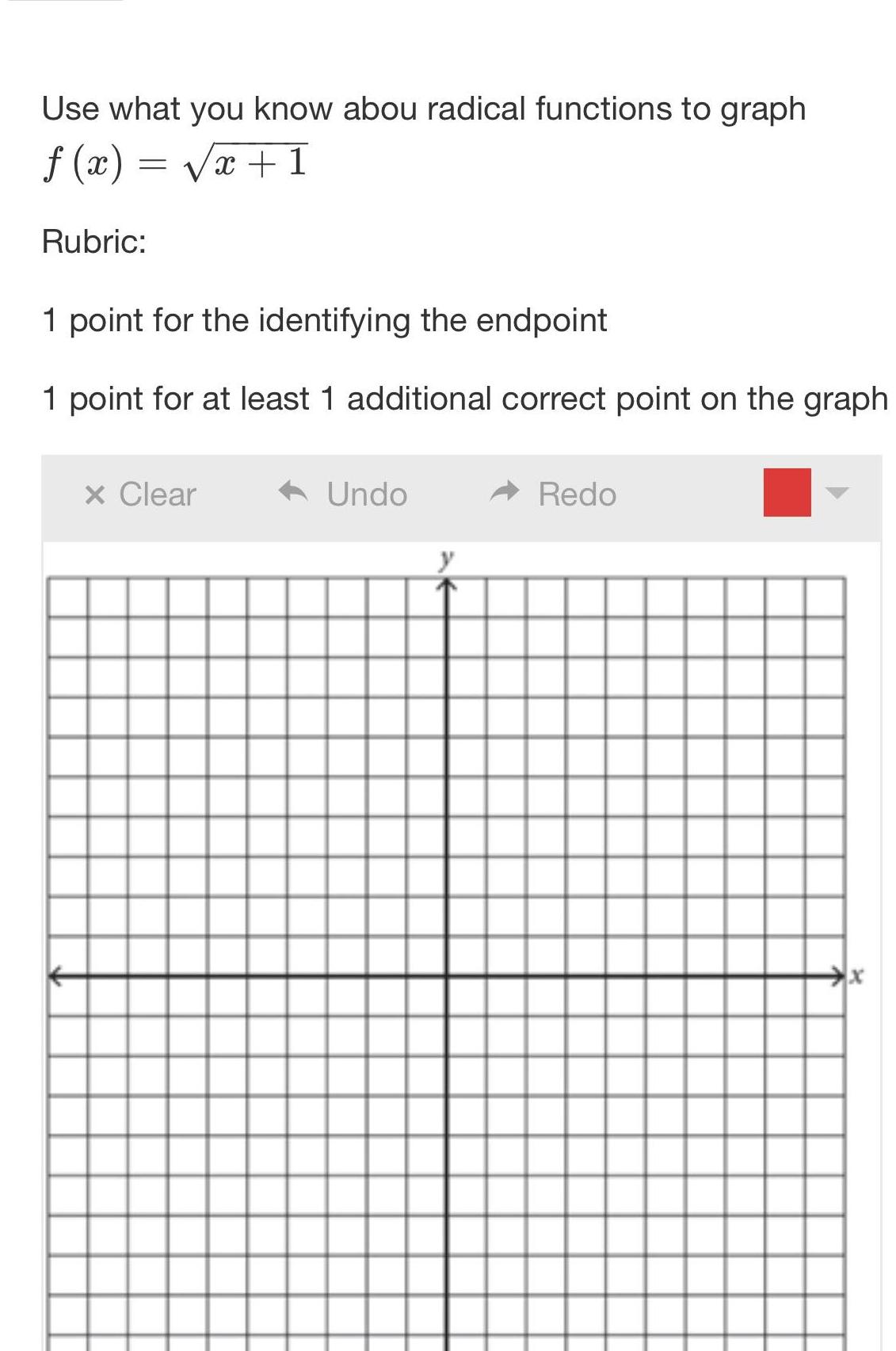 Use what you know abou radical functions to graph f x x 1 Rubric 1 point for the identifying the endpoint 1 point for at least 1 additional correct point on the graph x Clear Undo Redo