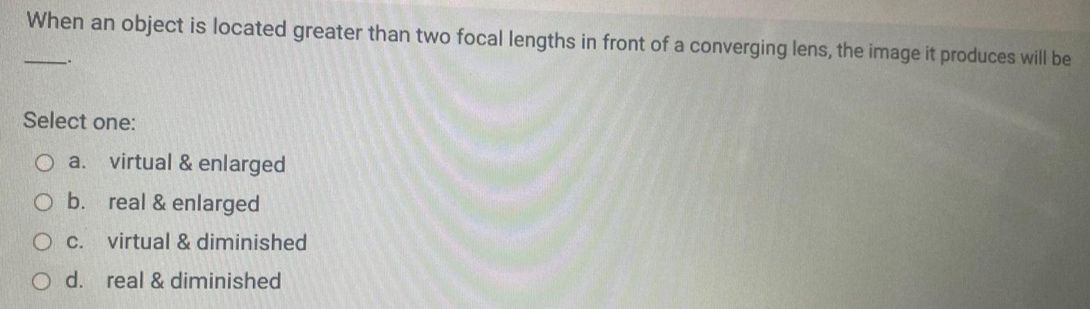 When an object is located greater than two focal lengths in front of a converging lens the image it produces will be Select one O a virtual enlarged O b real enlarged OC virtual diminished O d real diminished