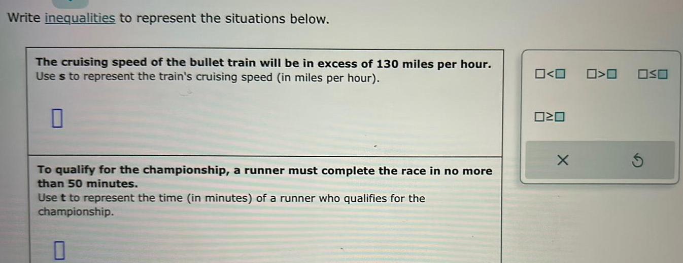 Write inequalities to represent the situations below The cruising speed of the bullet train will be in excess of 130 miles per hour Use s to represent the train s cruising speed in miles per hour 0 To qualify for the championship a runner must complete the race in no more than 50 minutes Use t to represent the time in minutes of a runner who qualifies for the championship 0 0 0 X 0 0 OSO