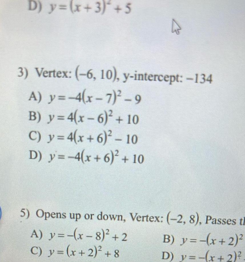 Quadratic equationsD y x 3 5 3 Vertex 6 10 y intercept 134 A y 4 x 7 9 B y 4 x 6 10 C y 4 x 6 10 D y 4 x 6 10 5 Opens up or down Vertex 2 8 Passes th A y x 8 2 B y x 2 C y x 2 8 D y x 2