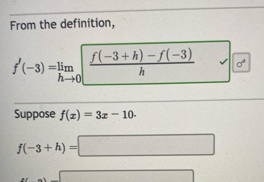 Limits & ContinuityFrom the definition f 3 lim h 0 f 3 h f 3 h Suppose f x 14 3x f 3 h f 3 OF