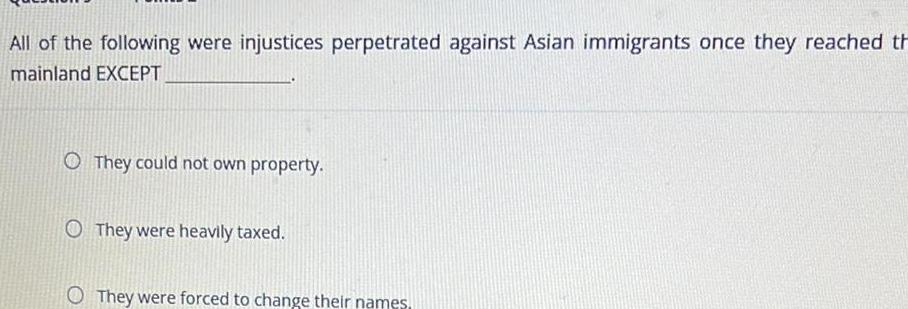 Anatomy of Flowering PlantsAll of the following were injustices perpetrated against Asian immigrants once they reached th mainland EXCEPT O They could not own property They were heavily taxed They were forced to change their names