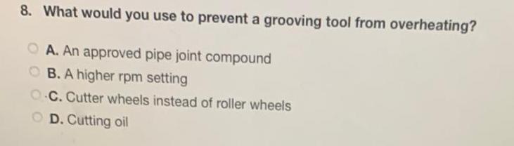 Anatomy of Flowering Plants8 What would you use to prevent a grooving tool from overheating OA An approved pipe joint compound OB A higher rpm setting O C Cutter wheels instead of roller wheels O D Cutting oil
