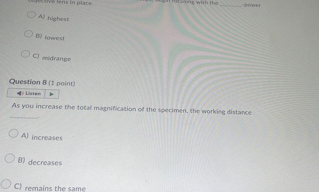 Anatomy of Flowering Plantslens in place A highest B lowest C midrange Question 8 1 point Listen A increases As you increase the total magnification of the specimen the working distance B decreases focusing with the C remains the same power
