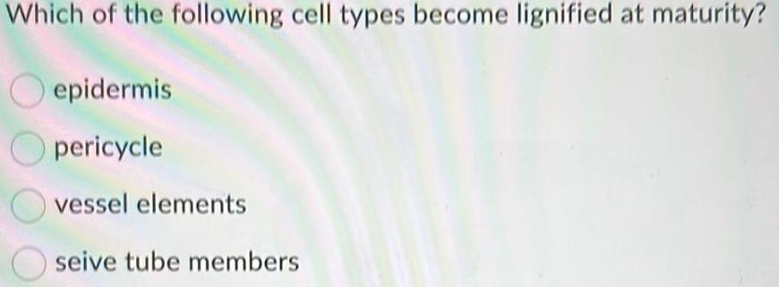 Anatomy of Flowering PlantsWhich of the following cell types become lignified at maturity epidermis pericycle vessel elements seive tube members