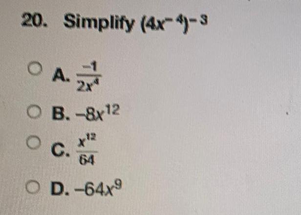 Basic Math14 Which of the following is one of the two binomial factors of 6s 40s 64 OA 2s 16 OB s 10 OC 6s 12 OD 3s 4