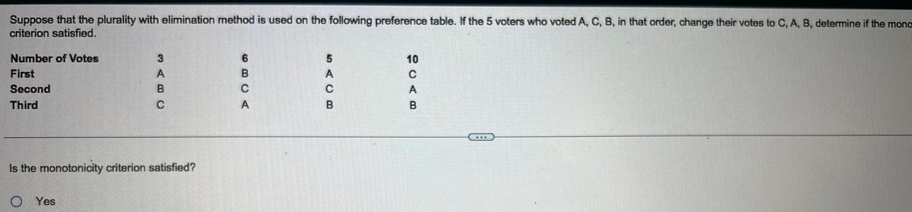 Mathematical ReasoningSuppose that the plurality with elimination method is used on the following preference table If the 5 voters who voted A C B in that order change their votes to C A B determine if the monas criterion satisfied Number of Votes First Second Third 3 A B C Is the monotonicity criterion satisfied O Yes SBCA 6 5 ACB CCAB 10