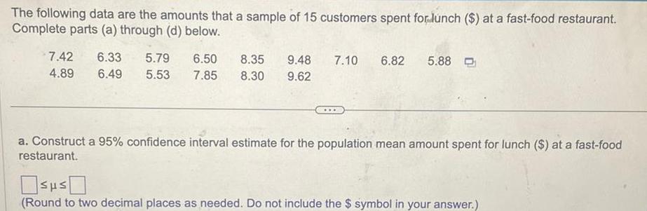 StatisticsThe following data are the amounts that a sample of 15 customers spent for lunch at a fast food restaurant Complete parts a through d below 7 42 6 33 5 79 6 50 8 35 9 48 7 10 6 82 4 89 6 49 5 53 7 85 8 30 9 62 5 88 a Construct a 95 confidence interval estimate for the population mean amount spent for lunch at a fast food restaurant Mps Round to two decimal places as needed Do not include the symbol in your answer