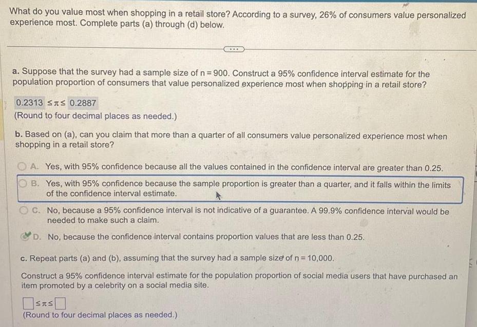 StatisticsWhat do you value most when shopping in a retail store According to a survey 26 of consumers value personalized experience most Complete parts a through d below a Suppose that the survey had a sample size of n 900 Construct a 95 confidence interval estimate for the population proportion of consumers that value personalized experience most when shopping in a retail store 0 2313 ST 0 2887 Round to four decimal places as needed b Based on a can you claim that more than a quarter of all consumers value personalized experience most when shopping in a retail store OA Yes with 95 confidence because all the values contained in the confidence interval are greater than 0 25 B Yes with 95 confidence because the sample proportion is greater than a quarter and it falls within the limits of the confidence interval estimate A C No because a 95 confidence interval is not indicative of a guarantee A 99 9 confidence interval would be needed to make such a claim D No because the confidence interval contains proportion values that are less than 0 25 c Repeat parts a and b assuming that the survey had a sample size of n 10 000 Construct a 95 confidence interval estimate for the population proportion of social media users that have purchased an item promoted by a celebrity on a social media site SAS Round to four decimal places as needed