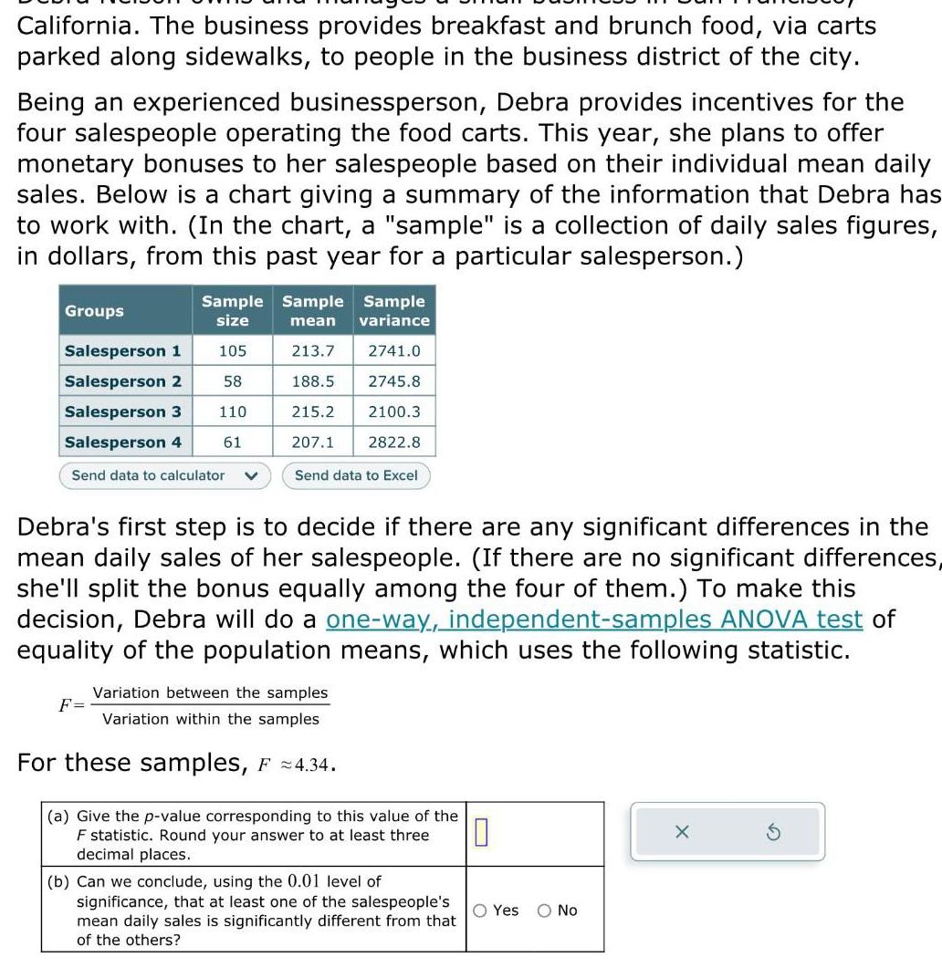 StatisticsCalifornia The business provides breakfast and brunch food via carts parked along sidewalks to people in the business district of the city Being an experienced businessperson Debra provides incentives for the four salespeople operating the food carts This year she plans to offer monetary bonuses to her salespeople based on their individual mean daily sales Below is a chart giving a summary of the information that Debra has to work with In the chart a sample is a collection of daily sales figures in dollars from this past year for a particular salesperson Sample Sample Sample mean variance size Salesperson 1 105 213 7 2741 0 Salesperson 2 58 188 5 2745 8 Salesperson 3 110 215 2 2100 3 Salesperson 4 61 207 1 2822 8 Send data to calculator Groups Send data to Excel Debra s first step is to decide if there are any significant differences in the mean daily sales of her salespeople If there are no significant differences she ll split the bonus equally among the four of them To make this decision Debra will do a one way independent samples ANOVA test of equality of the population means which uses the following statistic Variation between the samples Variation within the samples For these samples F 4 34 F a Give the p value corresponding to this value of the F statistic Round your answer to at least three decimal places 10 b Can we conclude using the 0 01 level of significance that at least one of the salespeople s mean daily sales is significantly different from that of the others O Yes O No