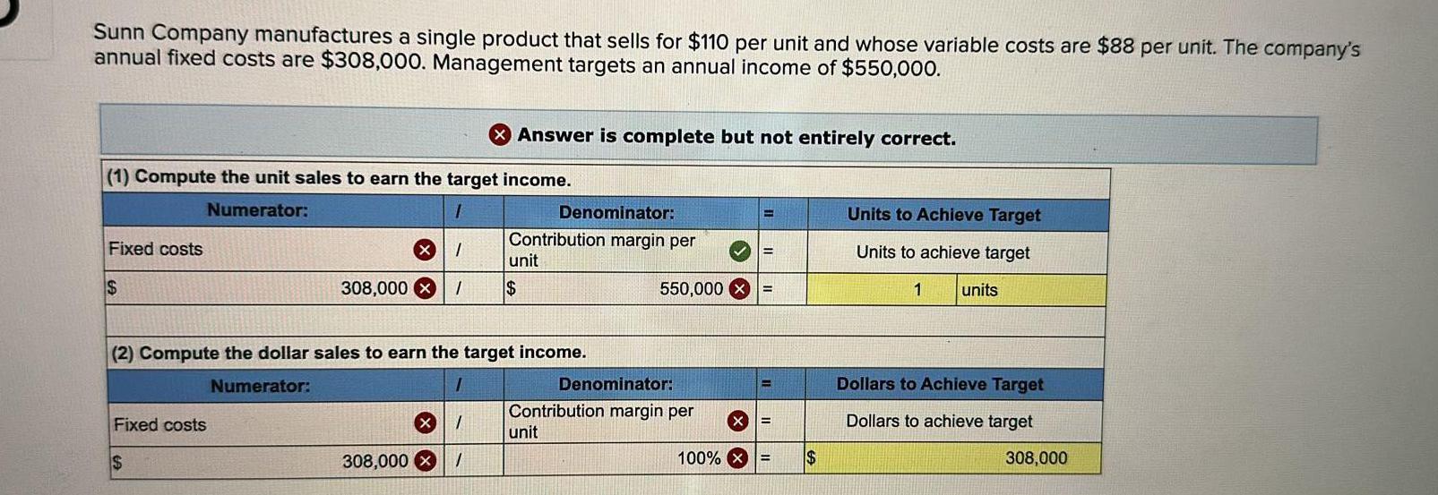 Coordinate systemSunn Company manufactures a single product that sells for 110 per unit and whose variable costs are 88 per unit The company s annual fixed costs are 308 000 Management targets an annual income of 550 000 1 Compute the unit sales to earn the target income Numerator 1 X 1 308 000 x 1 Fixed costs Answer is complete but not entirely correct Fixed costs Denominator Contribution margin per unit 2 Compute the dollar sales to earn the target income Numerator I X 1 308 000x 1 Denominator Contribution margin per unit E 550 000 X 100 X X B E Units to Achieve Target Units to achieve target 1 units Dollars to Achieve Target Dollars to achieve target 308 000