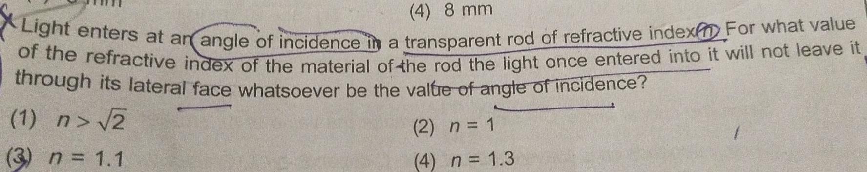 Geometrical Optics4 8 mm Light enters at an angle of incidence in a transparent rod of refractive index For what value of the refractive index of the material of the rod the light once entered into it will not leave it through its lateral face whatsoever be the value of angle of incidence 1 n 2 3 n 1 1 2 n 1 4 n 1 3
