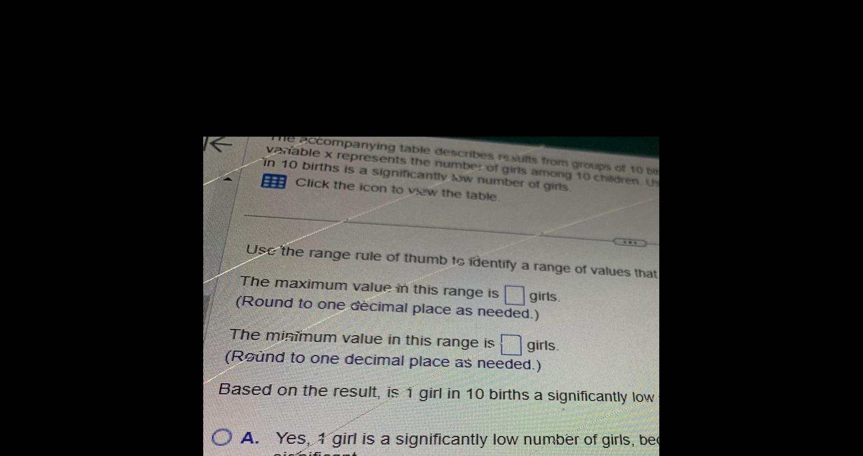 ProbabilityK The accompanying table describes results from groups of 10 b variable x represents the number of girts among 10 children US in 10 births is a significantly low number of girls Click the icon to view the table Use the range rule of thumb to identify a range of values that The maximum value in this range is Round to one d cimal place as needed girls The minimum value in this range is Round to one decimal place as needed Based on the result is 1 girl in 10 births a significantly low A Yes 1 girl is a significantly low number of girls be girls