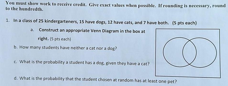 ProbabilityYou must show work to receive credit Give exact values when possible If rounding is necessary round to the hundredth 1 In a class of 25 kindergarteners 15 have dogs 12 have cats and 7 have both 5 pts each a Construct an appropriate Venn Diagram in the box at right 5 pts each b How many students have neither a cat nor a dog c What is the probability a student has a dog given they have a cat D d What is the probability that the student chosen at random has at least one pet