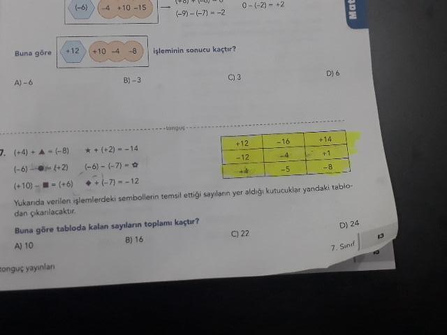(-6) (4 + 10-15 0-1-2) +2 (-9)-(-7) = -2 Mat Buna göre +12 +10 -4 -8 işleminin sonucu kaçtır? D) 6 A)-6 B) -3 C) 3 7. (+4) + (-8) + (+2) - 14 + 12 -16 I +14 (-6) --- 4+2 -12 -4 +1 1-6)-(-7) - * -5 I -8 1 (+10) - = (+6) +(-7) = -12 Yukanda verilen işlemlerdeki sembollerin temsil ettiği sayılann yer aldığı kutucuklar yandaki tablo dan çıkanlacaktır. Buna göre tabloda kalan sayıların toplamı kaçtır? A) 10 B) 16 C) 22 D) 24 7. Sinif tonguç yayınlan