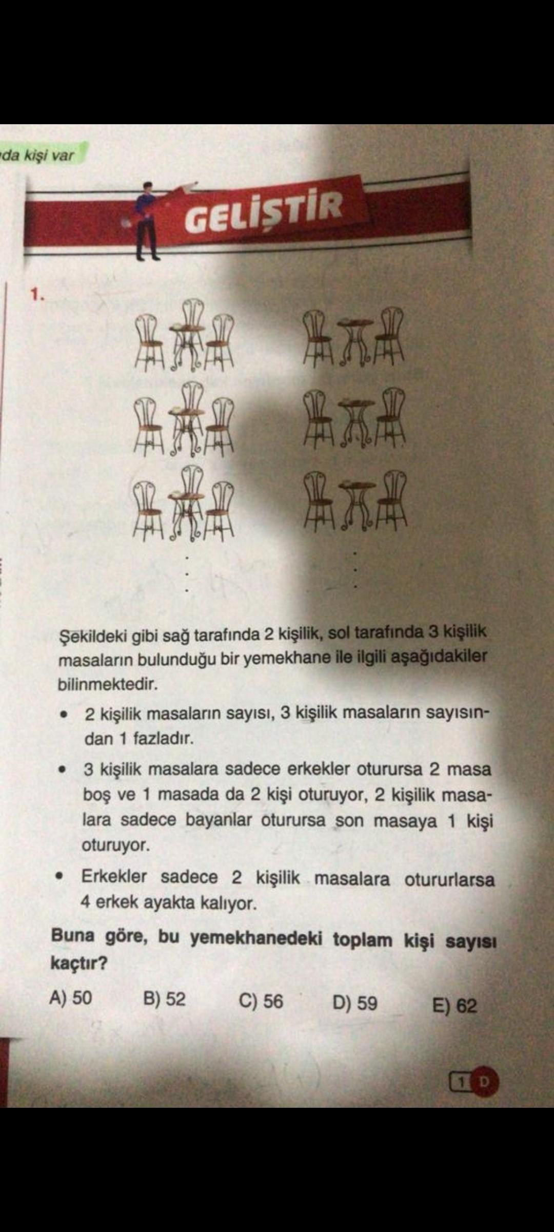-da kişi var GELİŞTİR 1. MAR ** Şekildeki gibi sağ tarafında 2 kişilik, sol tarafında 3 kişilik masaların bulunduğu bir yemekhane ile ilgili aşağıdakiler bilinmektedir. • 2 kişilik masaların sayısı, 3 kişilik masaların sayısın- dan 1 fazladır. • 3 kişilik masalara sadece erkekler oturursa 2 masa boş ve 1 masada da 2 kişi oturuyor, 2 kişilik masa- lara sadece bayanlar oturursa son masaya 1 kişi oturuyor. • Erkekler sadece 2 kişilik masalara otururlarsa 4 erkek ayakta kalıyor. Buna göre, bu yemekhanedeki toplam kişi sayısı kaçtır? A) 50 B) 52 C) 56 D) 59 E) 62 1D