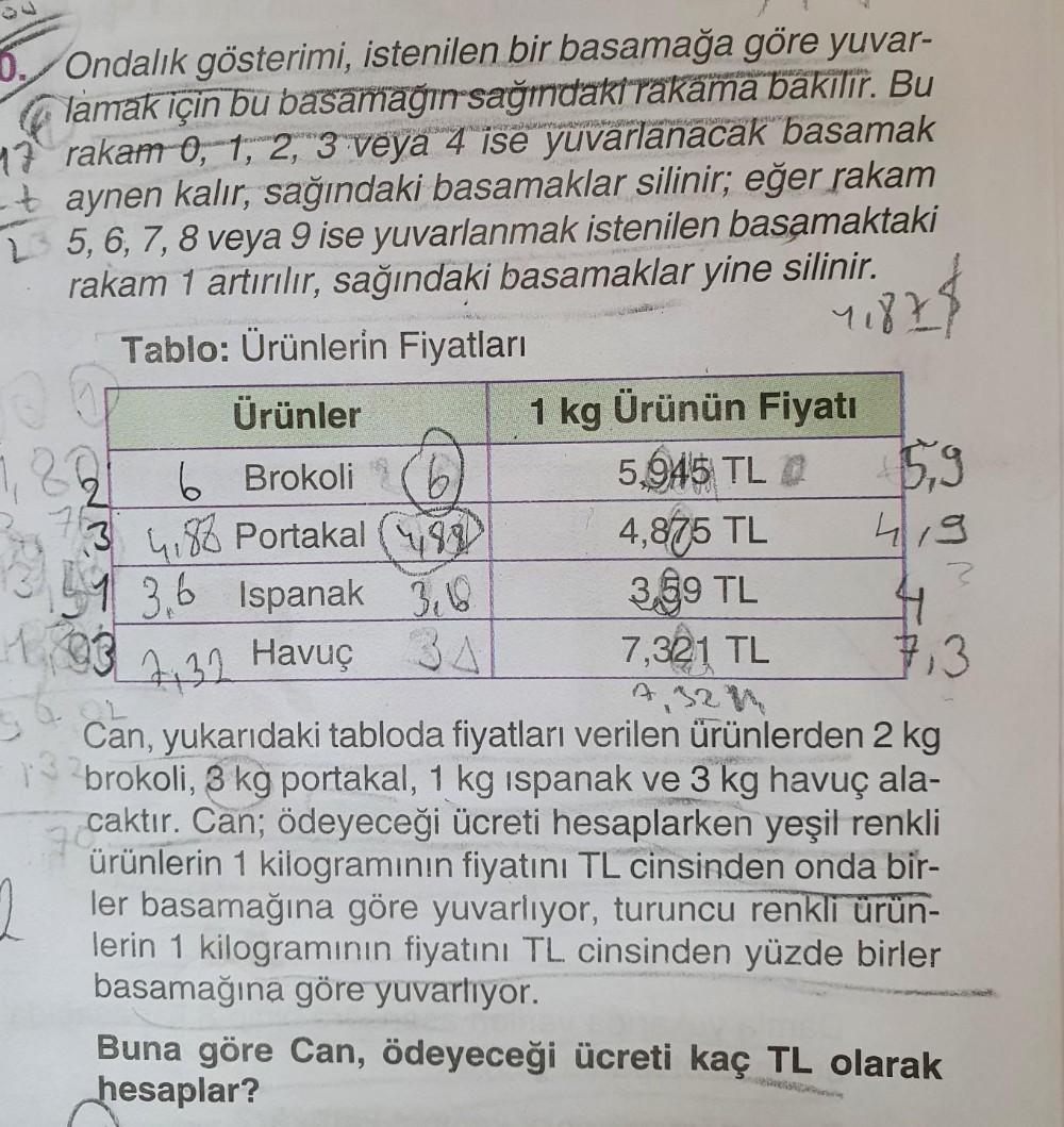0. 9 Ondalık gösterimi, istenilen bir basamağa göre yuvar- lamak için bu basamağırsağıdaki rakama bakılır. Bu 17 rakam 0, 1, 2, 3 veya 4 ise yuvarlanacak basamak aynen kalır, sağındaki basamaklar silinir; eğer rakam 25, 6, 7, 8 veya 9 ise yuvarlanmak istenilen basamaktaki rakam 1 artırılır, sağındaki basamaklar yine silinir. Tablo: Ürünlerin Fiyatları 1182 Ürünler 1 kg Ürünün Fiyatı 122 6 Brokoli 5,945 TL 15,9 3 4.82 Portakal (493 4,875 TL 4,9 143.6 Ispanak Bello 3 3,99 TL 4 7,321 TL 7,3 L A Bu Can, yukarıdaki tabloda fiyatları verilen ürünlerden 2 kg brokoli, 3 kg portakal, 1 kg ispanak ve 3 kg havuç ala- 7 caktır. Can; ödeyeceği ücreti hesaplarken yeşil renkli ürünlerin 1 kilogramının fiyatını TL cinsinden onda bir- 2 ler basamağına göre yuvarlıyor, turuncu renkli ürün- lerin 1 kilogramının fiyatını TL cinsinden yüzde birler basamağına göre yuvarlıyor. Buna göre Can, ödeyeceği ücreti kaç TL olarak hesaplar? 103 BA 2432 Havuç 5