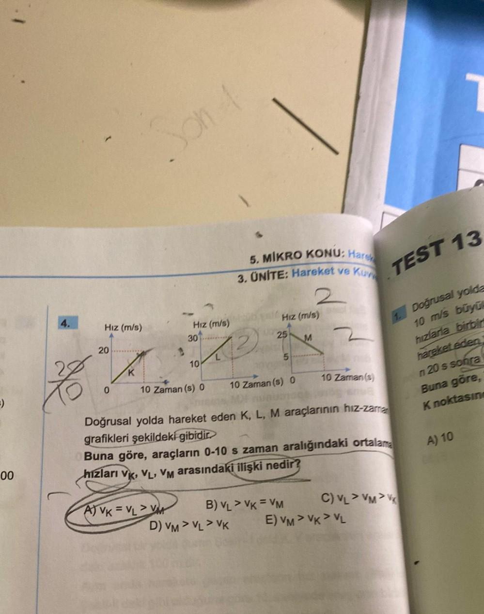 =) 00 4. Hız (m/s) 20 0 1 Son 4 K Hız (m/s) X2 30 10 10 Zaman (s) 0 A) VK=VL> V 5. MİKRO KONU: Hare 3. ÜNİTE: Hareket ve Hız (m/