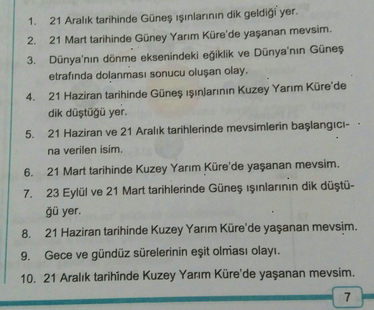 1. 21 Aralık tarihinde Güneş ışınlarının dik geldiği yer. 2. 21 Mart tarihinde Güney Yarım Küre'de yaşanan mevsim. 3. Dünya'nın dönme eksenindeki eğiklik ve Dünya'nın Güneş etrafında dolanması sonucu oluşan olay. 4. 21 Haziran tarihinde Güneş ışınlarının Kuzey Yarım Küre'de dik düştüğü yer 5. 21 Haziran ve 21 Aralık tarihlerinde mevsimlerin başlangıcı- na verilen isim. 6. 21 Mart tarihinde Kuzey Yarım Küre'de yaşanan mevsim. 7. 23 Eylül ve 21 Mart tarihlerinde Güneş ışınlarının dik düştü- ğü yer. 8. 21 Haziran tarihinde Kuzey Yarım Küre'de yaşanan mevsim. 9. Gece ve gündüz sürelerinin eşit olması olayı. 10. 21 Aralık tarihinde Kuzey Yarım Küre'de yaşanan mevsim. 7