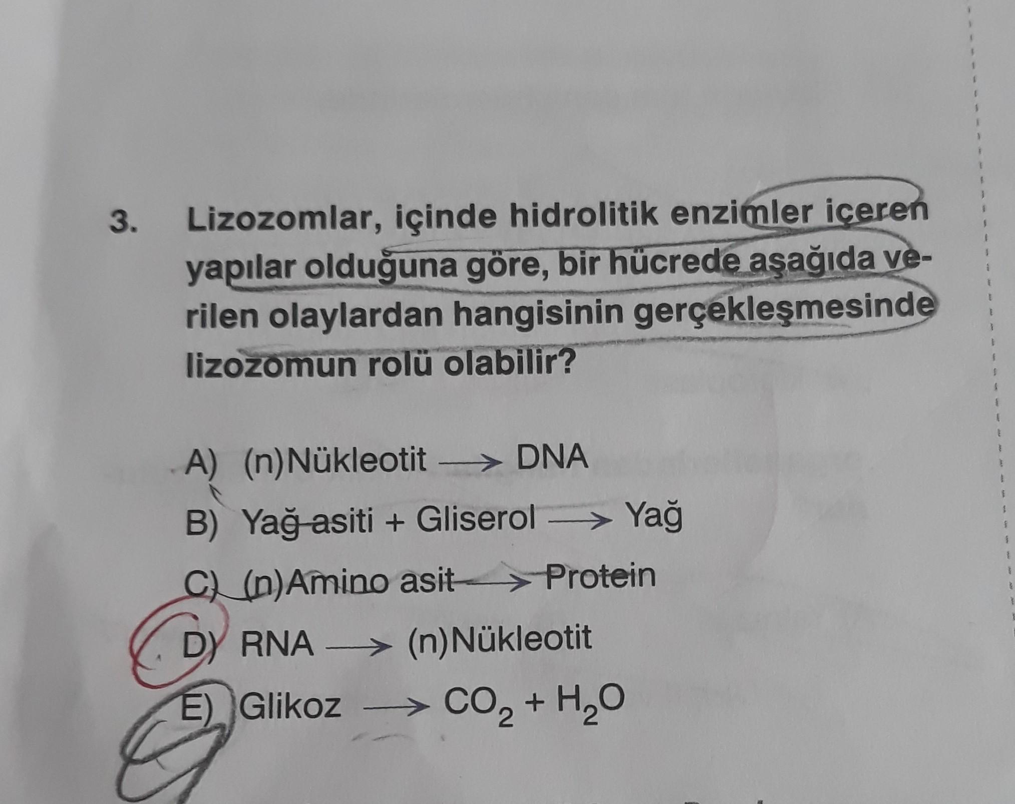 1 3. Lizozomlar, içinde hidrolitik enzimler içeren yapılar olduğuna göre, bir hücrede aşağıda ve- rilen olaylardan hangisinin gerçekleşmesinde lizozomun rolü olabilir? $ 8 A) (n)Nükleotit -> DNA B) Yağ asiti + Gliserol → Yağ Ch (n) Amino asit - Protein DYRNA -> (n)Nükleotit E) Glikoz > CO2 + H2O