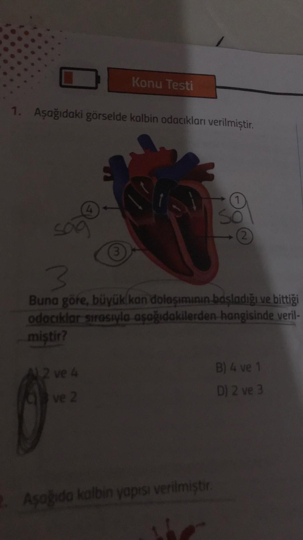1. Aşağıdaki görselde kalbin odacıkları verilmiştir. 4 sağ 12 ve 4 ve 2 Konu Testi 3 1 3 Buna göre, büyük kan dolaşımının başlad