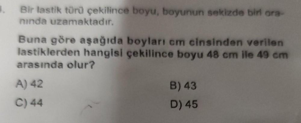 1. Bir lastik türü çekilince boyu, boyunun sekizde bir ora- nında uzamaktadır. Buna göre aşağıda boyları cm cinsinden verilen lastiklerden hangisi çekilince boyu 48 cm ile 49 cm arasında olur? A) 42 C) 44 B) 43 D) 45