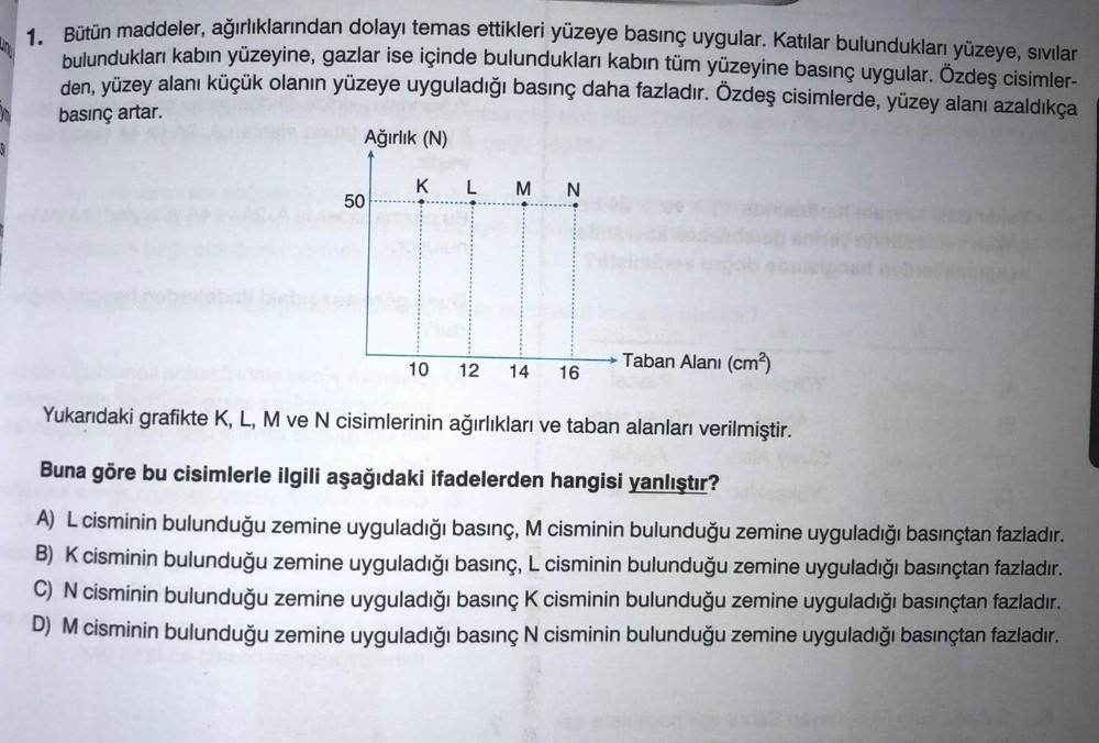 1. Bütün maddeler, ağırlıklarından dolayı temas ettikleri yüzeye basınç uygular. Katılar bulundukları yüzeye, sıvılar bulundukları kabın yüzeyine, gazlar ise içinde bulundukları kabın tüm yüzeyine basınç uygular. Özdeş cisimler- den, yüzey alanı küçük olanın yüzeye uyguladığı basınç daha fazladır. Özdeş cisimlerde, yüzey alanı azaldıkça basınç artar. Ağırlık (N) K L M N 50 Taban Alanı (cm) 10 12 14 16 Yukarıdaki grafikte K, L, M ve N cisimlerinin ağırlıkları ve taban alanları verilmiştir. Buna göre bu cisimlerle ilgili aşağıdaki ifadelerden hangisi yanlıştır? A) L cisminin bulunduğu zemine uyguladığı basınç, M cisminin bulunduğu zemine uyguladığı basınçtan fazladır. B) K cisminin bulunduğu zemine uyguladığı basınç, L cisminin bulunduğu zemine uyguladığı basınçtan fazladır. C) N cisminin bulunduğu zemine uyguladığı basınç K cisminin bulunduğu zemine uyguladığı basınçtan fazladır. D) M cisminin bulunduğu zemine uyguladığı basınç N cisminin bulunduğu zemine uyguladığı basınçtan fazladır.