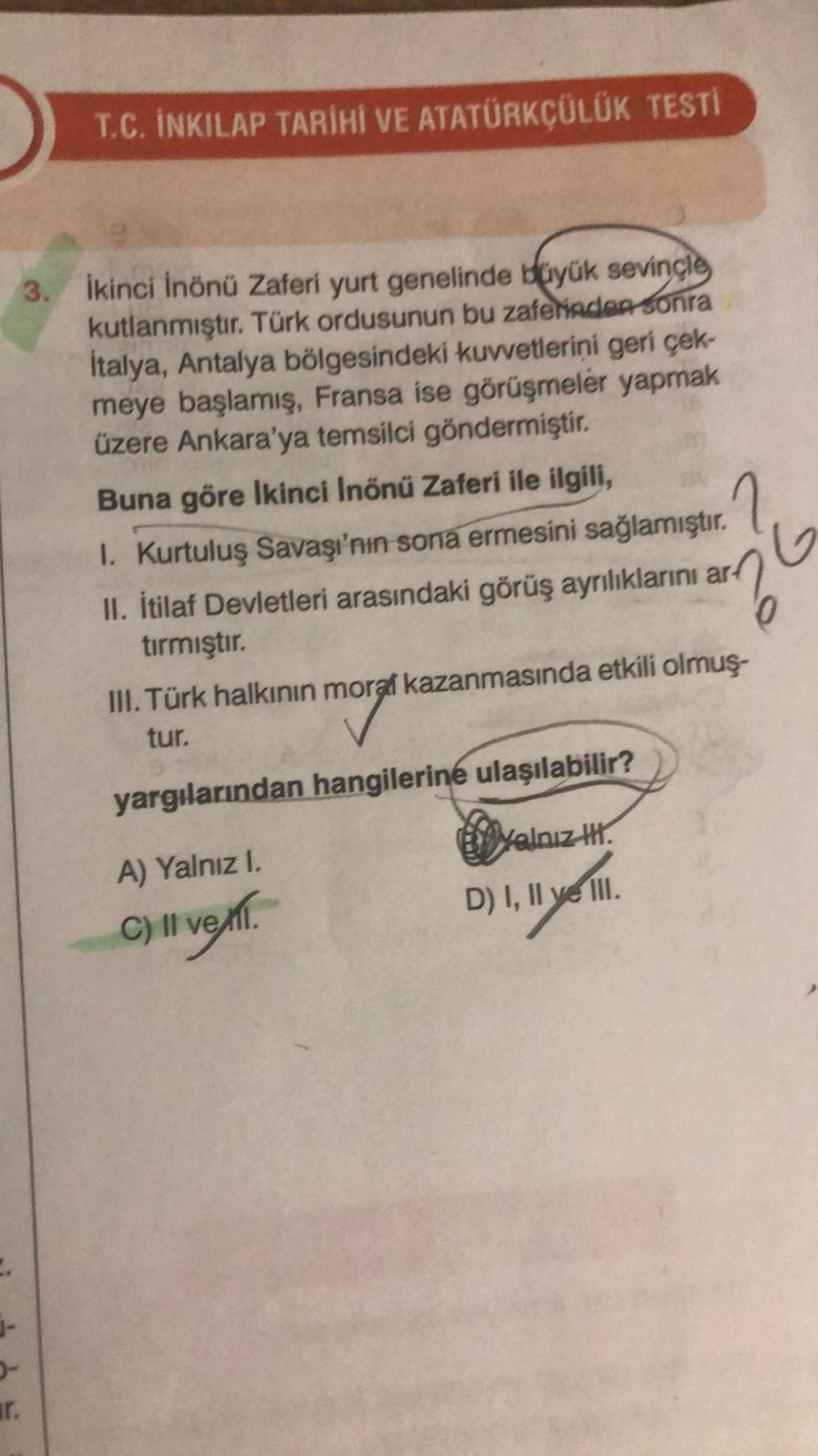 1- D- T.C. İNKILAP TARİHİ VE ATATÜRKÇÜLÜK TESTİ 3. İkinci İnönü Zaferi yurt genelinde büyük sevinçle kutlanmıştır. Türk ordusunun bu zaferinden sonra İtalya, Antalya bölgesindeki kuvvetlerini geri çek- meye başlamış, Fransa ise görüşmeler yapmak üzere Ankara'ya temsilci göndermiştir. Buna göre İkinci Inönü Zaferi ile ilgili, 1. Kurtuluş Savaşı'nın sona ermesini sağlamıştır. II. İtilaf Devletleri arasındaki görüş ayrılıklarını ar tırmıştır. 1 6 III. Türk halkının mora kazanmasında etkili olmuş- tur. yargılarından hangilerine ulaşılabilir? A) Yalnız I. C) II vexí. BYalnız I. D) I, II ve III.