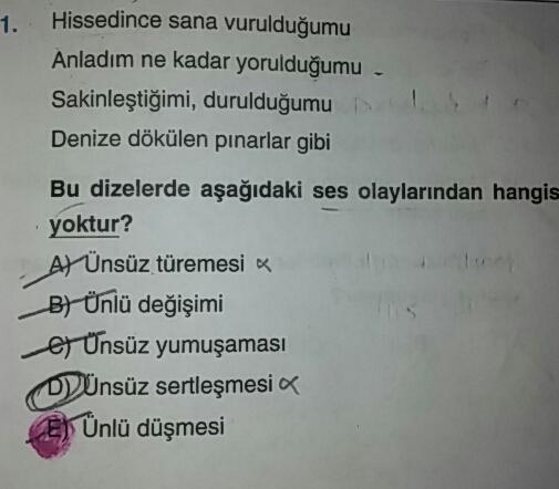 1. Hissedince sana vurulduğumu Anladım ne kadar yorulduğumu - Sakinleştiğimi, durulduğumu Denize dökülen pinarlar gibi Bu dizelerde aşağıdaki ses olaylarından hangis yoktur? AY Ünsüz türemesi B) Ünlü değişimi e Unsüz yumuşaması ODünsüz sertleşmesi CE) Ünlü düşmesi