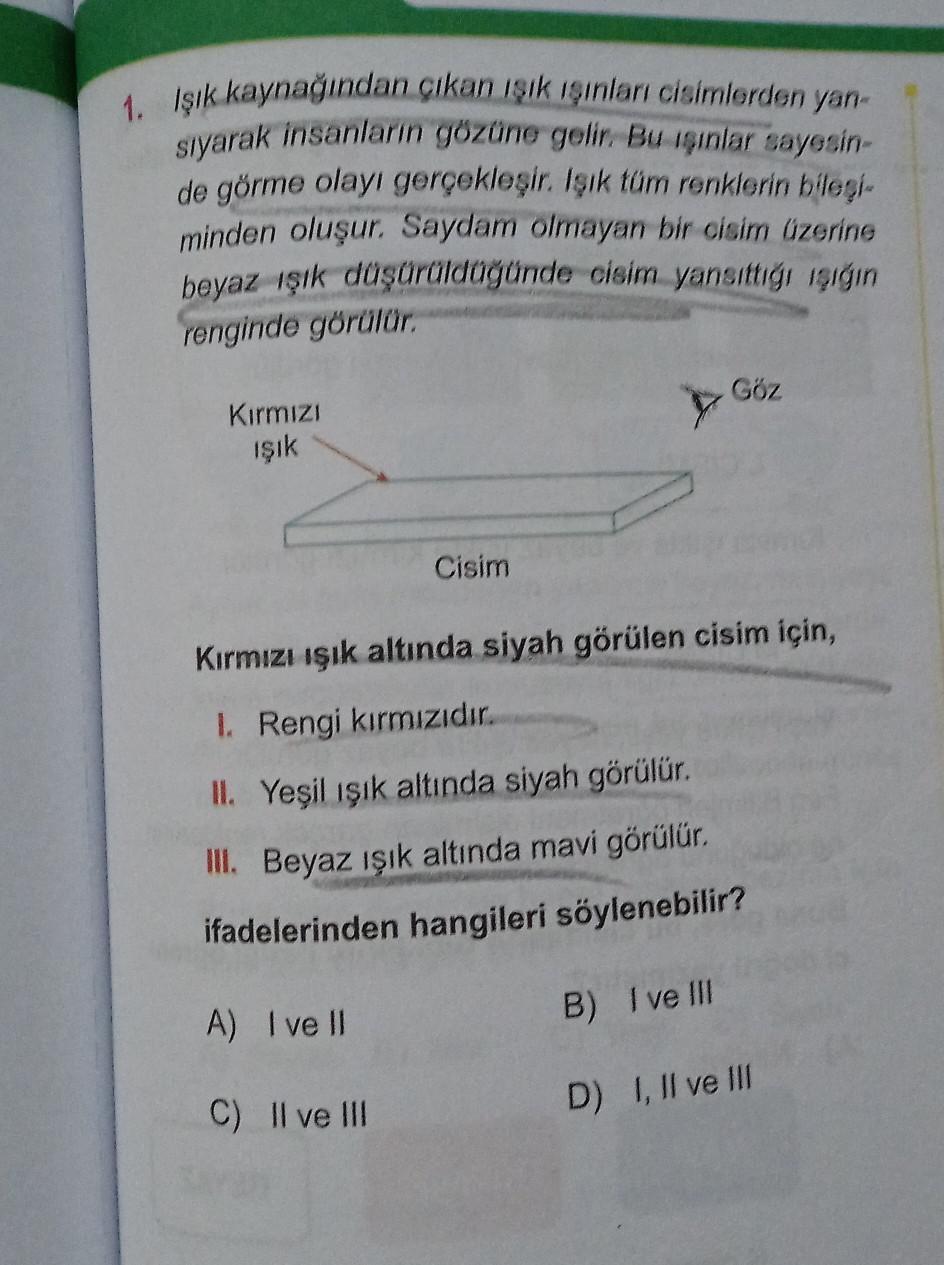 1. Işık kaynağından çıkan ışık ışınları cisimlerden yan- sıyarak insanların gözüne gelir. Bu ışınlar sayesin- de görme olayı gerçekleşir. Işık tüm renklerin bileşi- minden oluşur. Saydam olmayan bir cisim üzerine beyaz ışık düşürüldüğünde cisim yansıttığı ışığın renginde görülür. Kırmızı ışık Cisim Göz Kırmızı ışık altında siyah görülen cisim için, 1. Rengi kırmızıdır. II. Yeşil ışık altında siyah görülür. III. Beyaz ışık altında mavi görülür. ifadelerinden hangileri söylenebilir? A) I ve II B) Ive Ill C) II ve III D) I, II ve III