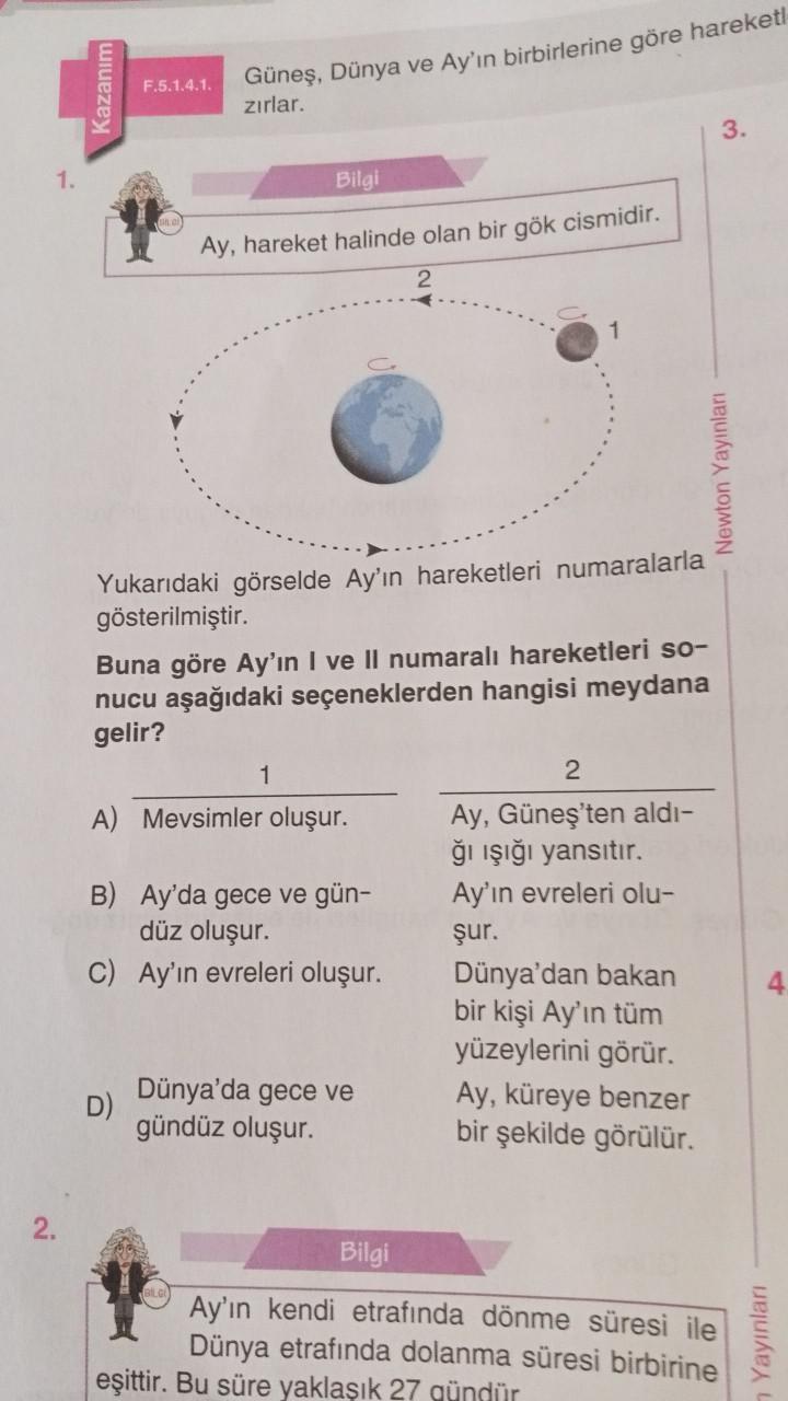 1. Kazanım F.5.1.4.1. Güneş, Dünya ve Ay'ın birbirlerine göre hareketl zırlar. Bilgi Ay, hareket halinde olan bir gök cismidir. 2 Yukarıdaki görselde Ay'ın hareketleri numaralarla gösterilmiştir. D) Buna göre Ay'ın I ve II numaralı hareketleri so- nucu aşağıdaki seçeneklerden hangisi meydana gelir? 1 A) Mevsimler oluşur. B) Ay'da gece ve gün- düz oluşur. C) Ay'ın evreleri oluşur. Dünya'da gece ve gündüz oluşur. Bilgi 2 Ay, Güneş'ten aldı- ğı ışığı yansıtır. Ay'ın evreleri olu- şur. Dünya'dan bakan bir kişi Ay'ın tüm yüzeylerini görür. Ay, küreye benzer bir şekilde görülür. 3. Newton Yayınları Ay'ın kendi etrafında dönme süresi ile Dünya etrafında dolanma süresi birbirine eşittir. Bu süre yaklaşık 27 gündür 4 Yayınları