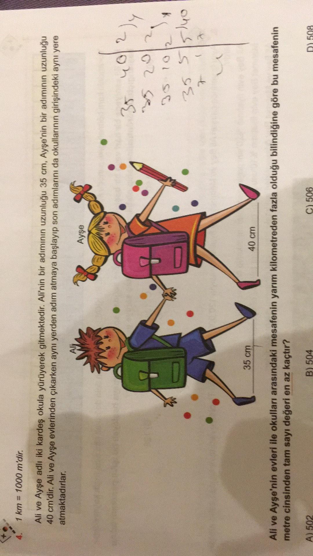 1 km = 1000 m'dir. Ali ve Ayşe adlı iki kardeş okula yürüyerek gitmektedir. Ali'nin bir adımının uzunluğu 35 cm, Ayşe'nin bir adımının uzunluğu 40 cm'dir. Ali ve Ayşe evlerinden çıkarken aynı yerden adım atmaya başlayıp son adımlarını da okullarının girişindeki aynı yere atmaktadırlar. Ayşe 4?)y 35 "5 2012 35 1012 35515lyo 7 u 35 cm 40 cm Ali ve Ayşe'nin evleri ile okulları arasındaki mesafenin yarım kilometreden fazla olduğu bilindiğine göre bu mesafenin metre cinsinden tam sayı değeri en az kaçtır? A) 502 B) 504 C) 506 D) 508