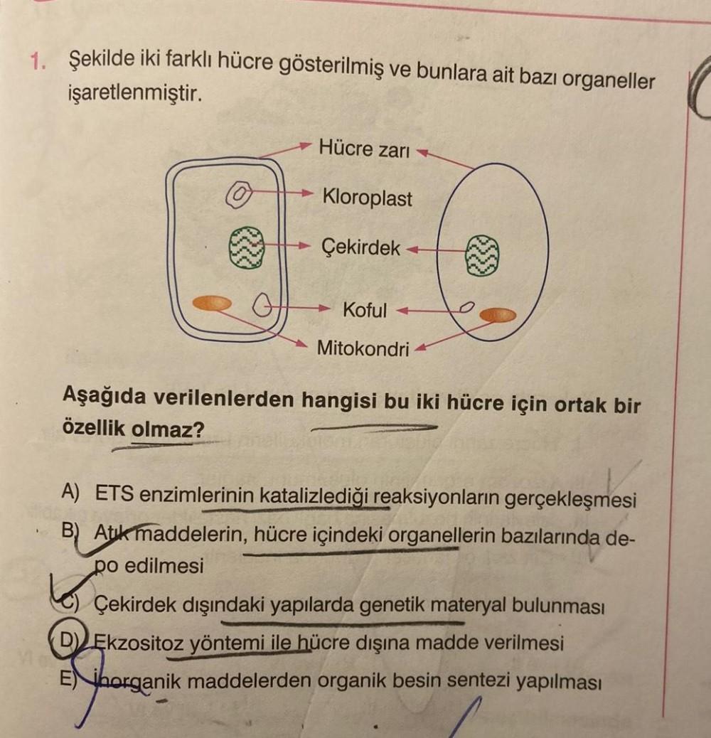 1. Şekilde iki farklı hücre gösterilmiş ve bunlara ait bazı organeller işaretlenmiştir. Hücre zarı Kloroplast BEO Çekirdek Koful Mitokondri Aşağıda verilenlerden hangisi bu iki hücre için ortak bir özellik olmaz? A) ETS enzimlerinin katalizlediği reaksiyonların gerçekleşmesi B) Atk maddelerin, hücre içindeki organellerin bazılarında de- po edilmesi Çekirdek dışındaki yapılarda genetik materyal bulunması DEkzositoz yöntemi ile hücre dışına madde verilmesi E inorganik maddelerden organik besin sentezi yapılması