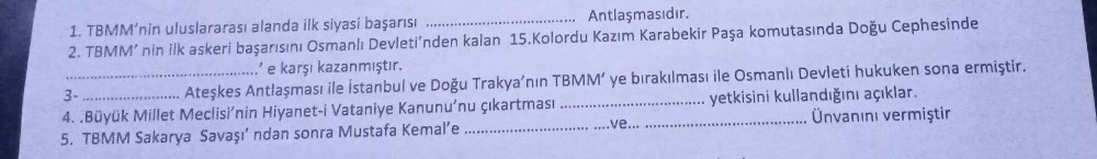 1. TBMM'nin uluslararası alanda ilk siyasi başarısı Antlaşmasıdır. 2. TBMM' nin ilk askeri başarısını Osmanlı Devleti'nden kalan 15.Kolordu Kazım Karabekir Paşa komutasında .......... e karşı kazanmıştır. 3-... Ateşkes Antlaşması ile İstanbul ve Doğu Trakya'nın TBMM' ye bırakılması 4. .Büyük Millet Meclisi'nin Hiyanet-i Vataniye Kanunu'nu çıkartması 5. TBMM Sakarya Savaşı' ndan sonra Mustafa Kemal'e ....ve... .... Doğu Cephesinde Devleti hukuken sona ermiştir. açıklar. vermiştir ile Osmanlı yetkisini kullandığını .......... Ünvanını