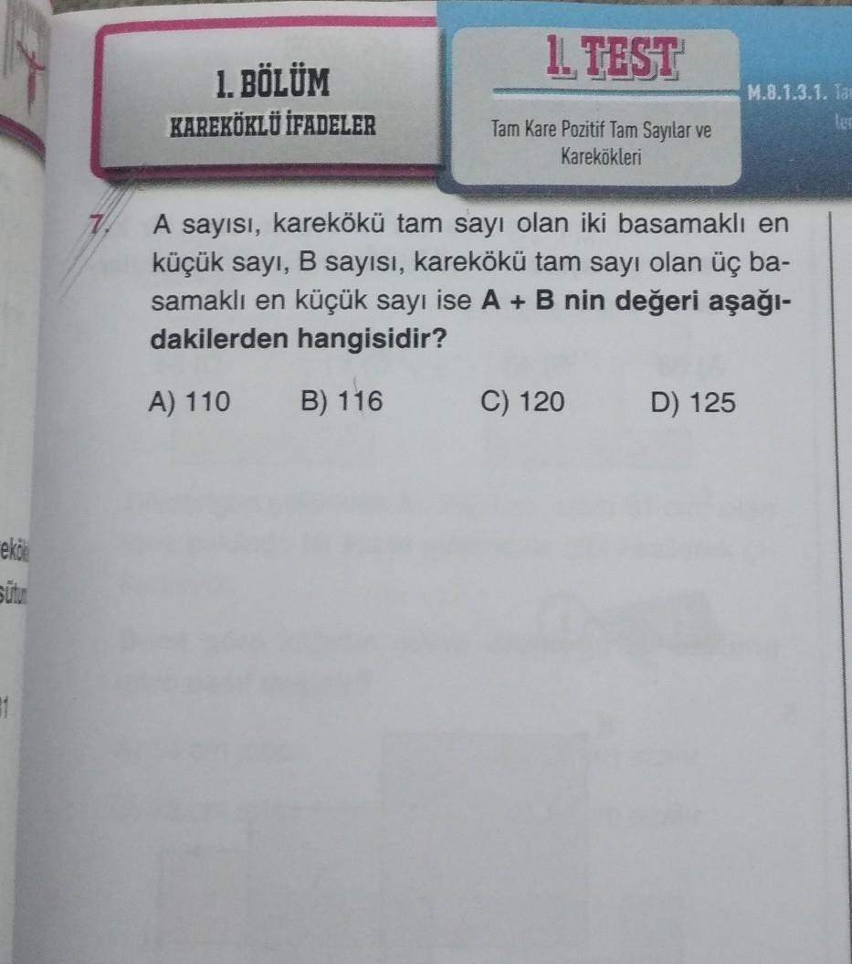 1. TEST 1. BÖLÜM KAREKÖKLÜ İFADELER M.8.1.3.1. Ta Tam Kare Pozitif Tam Sayılar ve karekökleri A sayısı, karekökü tam sayı olan iki basamaklı en küçük sayı, B sayısı, karekökü tam sayı olan üç ba- samaklı en küçük sayı ise A + B nin değeri aşağı- dakilerden hangisidir? A) 110 B) 116 C) 120 D) 125 sutu 11