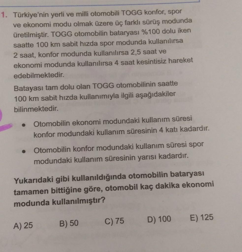 1. Türkiye'nin yerli ve milli otomobili TOGG konfor, spor ve ekonomi modu olmak üzere üç farklı sürüş modunda üretilmiştir. TOGG otomobilin bataryası %100 dolu iken saatte 100 km sabit hızda spor modunda kullanılırsa 2 saat, konfor modunda kullanılırsa 2,5 saat ve ekonomi modunda kullanılırsa 4 saat kesintisiz hareket edebilmektedir. Batayası tam dolu olan TOGG otomobilinin saatte 100 km sabit hızda kullanımıyla ilgili aşağıdakiler bilinmektedir. Otomobilin ekonomi modundaki kullanım süresi konfor modundaki kullanım süresinin 4 katı kadardır. Otomobilin konfor modundaki kullanım süresi spor modundaki kullanım süresinin yarısı kadardır. Yukarıdaki gibi kullanıldığında otomobilin bataryası tamamen bittiğine göre, otomobil kaç dakika ekonomi modunda kullanılmıştır? C) 75 D) 100 E) 125 B) 50 A) 25