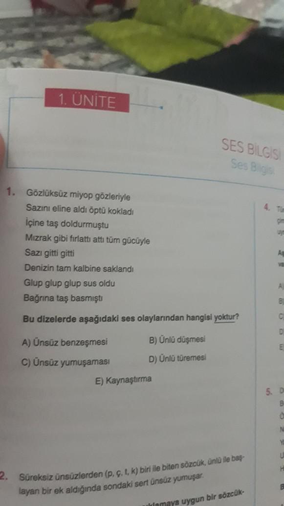 1. ÜNİTE 1. Gözlüksüz miyop gözleriyle Sazını eline aldı öptü kokladı içine taş doldurmuştu Mızrak gibi fırlattı attı tüm gücüyle Sazı gitti gitti Denizin tam kalbine saklandı Glup glup glup sus oldu Bağrına taş basmıştı Bu dizelerde aşağıdaki ses olaylarından hangisi yoktur? A) Ünsüz benzeşmesi C) Ünsüz yumuşaması B) Ünlü düşmesi D) Ünlü türemesi SES BILGIS Ses Bilgis E) Kaynaştırma 2. Süreksiz ünsüzlerden (p. c. t, k) biri ile biten sözcük, ünlü ile baş- layan bir ek aldığında sondaki sert ünsüz yumuşar. lamaya uygun bir sözcük- gim un Aq A 8 C D E 5. D B O U H B