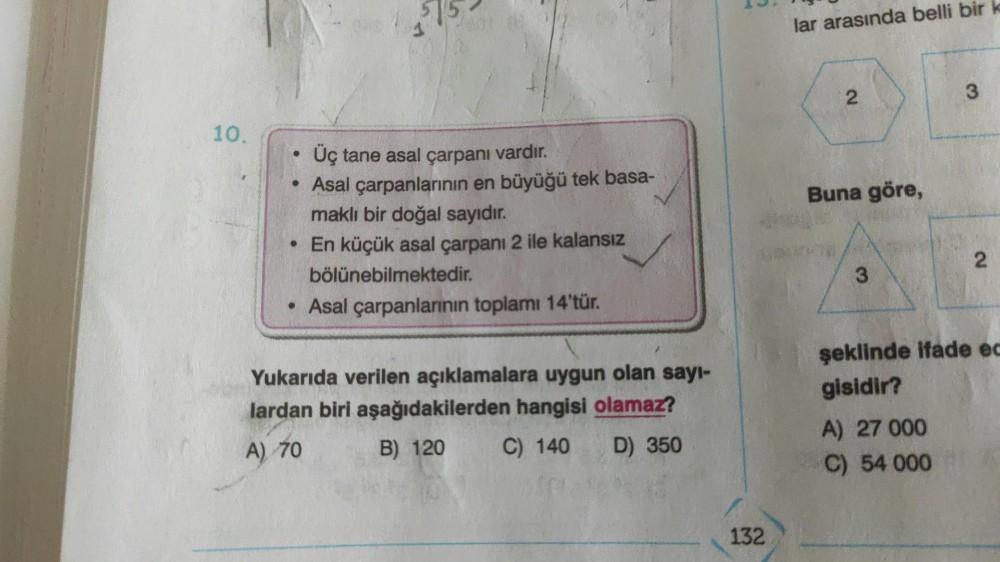 10. 1 ● Üç tane asal çarpanı vardır. • Asal çarpanlarının en büyüğü tek basa- maklı bir doğal sayıdır. • En küçük asal çarpanı 2 ile kalansız bölünebilmektedir. • Asal çarpanlarının toplamı 14'tür. Yukarıda verilen açıklamalara uygun olan sayı- lardan biri aşağıdakilerden hangisi olamaz? A) 70 B) 120 C) 140 D) 350 132 lar arasında belli bir k 2 Buna göre, 3 3 A) 27 000 C) 54 000 2 şeklinde ifade ec gisidir?