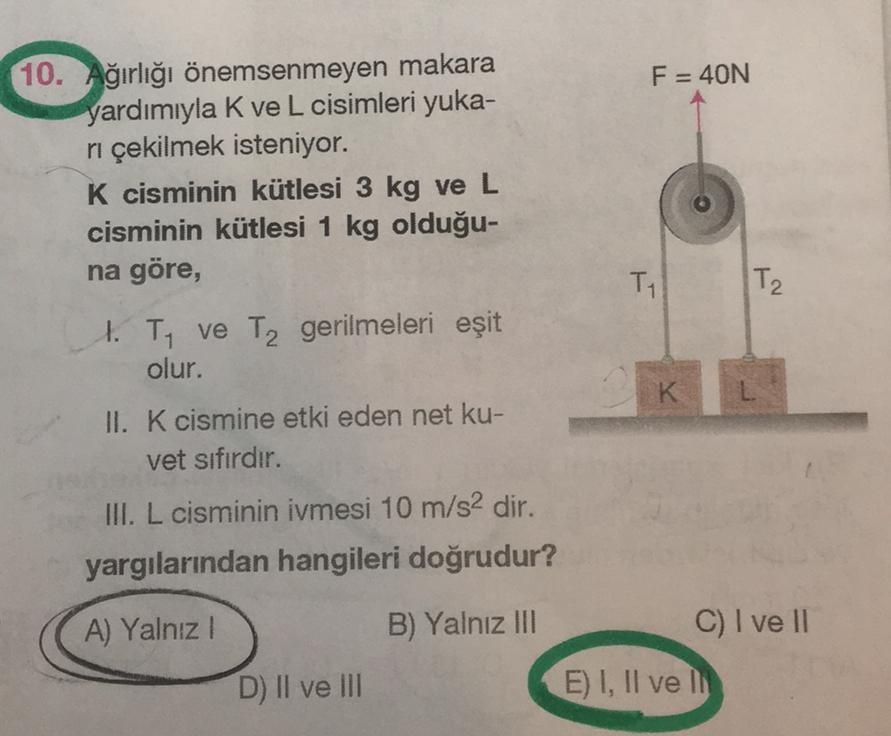 10. Ağırlığı önemsenmeyen makara yardımıyla K ve L cisimleri yuka- ri çekilmek isteniyor. K cisminin kütlesi 3 kg ve L cisminin kütlesi 1 kg olduğu- na göre, 1. T₁ ve T₂ gerilmeleri eşit olur. II. K cismine etki eden net ku- vet sıfırdır. III. L cisminin ivmesi 10 m/s² dir. yargılarından hangileri doğrudur? A) Yalnız I B) Yalnız III D) II ve III F = 40N T₁ K T₂ C) I ve II E) I, II ve I