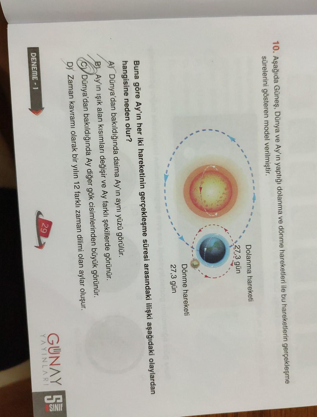 10. Aşağıda Güneş, Dünya ve Ay'ın yaptığı dolanma ve dönme hareketleri ile bu hareketlerin gerçekleşme sürelerini gösteren model verilmiştir. Dolanma hareketi 27,3 gün 1 1 Dönme hareketi 27,3 gün Buna göre Ay'ın her iki hareketinin gerçekleşme süresi arasındaki ilişki aşağıdaki olaylardan hangisine neden olur? A) Dünya'dan bakıldığında daima Ay'ın aynı yüzü görülür. Bl Ay'ın ışık alan kısımları değişir ve Ay farklı şekillerde görünür. Dünya'dan bakıldığında Ay diğer gök cisimlerinden büyük görünür. D) Zaman kavramı olarak bir yılın 12 farklı zaman dilimi olan aylar oluşur. GUNAY 52 29 YAYINLARI DENEME - 1