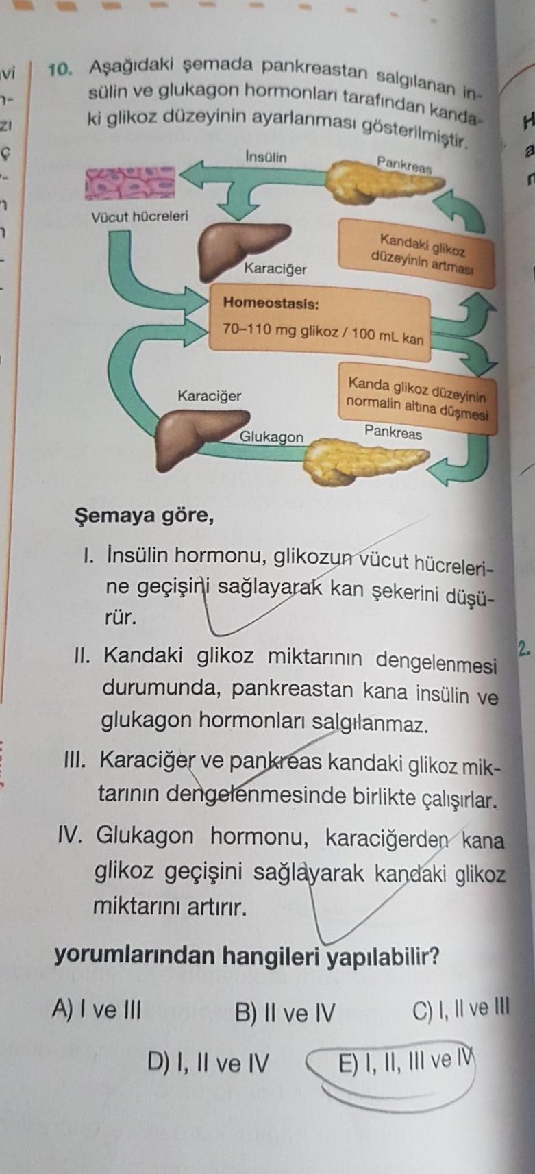 10. Aşağıdaki şemada pankrea sülin ve glukagon hormonları tarafınd ki glikoz düzeyinin ayarlanması g an salgılanan in- nları tarafından kanda- evinin ayarlanması gösterilmiştir. NO Insulin Pankreas Vücut hücreleri Kandaki glikoz düzeyinin artmasi Karaciğer Homeostasis: 70-110 mg glikoz / 100 ml kan Karaciğer Kanda glikoz düzeyinin normalin altına düşmesi Glukagon Pankreas Şemaya göre, I. İnsülin hormonu, glikozun vücut hücreleri- ne geçişini sağlayarak kan şekerini düşü- rür. II. Kandaki glikoz miktarının dengelenmesi durumunda, pankreastan kana insülin ve glukagon hormonları salgılanmaz. III. Karaciğer ve pankreas kandaki glikoz mik- tarının dengelenmesinde birlikte çalışırlar. IV. Glukagon hormonu, karaciğerden kana glikoz geçişini sağlayarak kandaki glikoz miktarını artırır. yorumlarından hangileri yapılabilir? A) I ve III B) II ve IV C) I, Il ve III D) I, II ve IV E) I, II, III ve IV