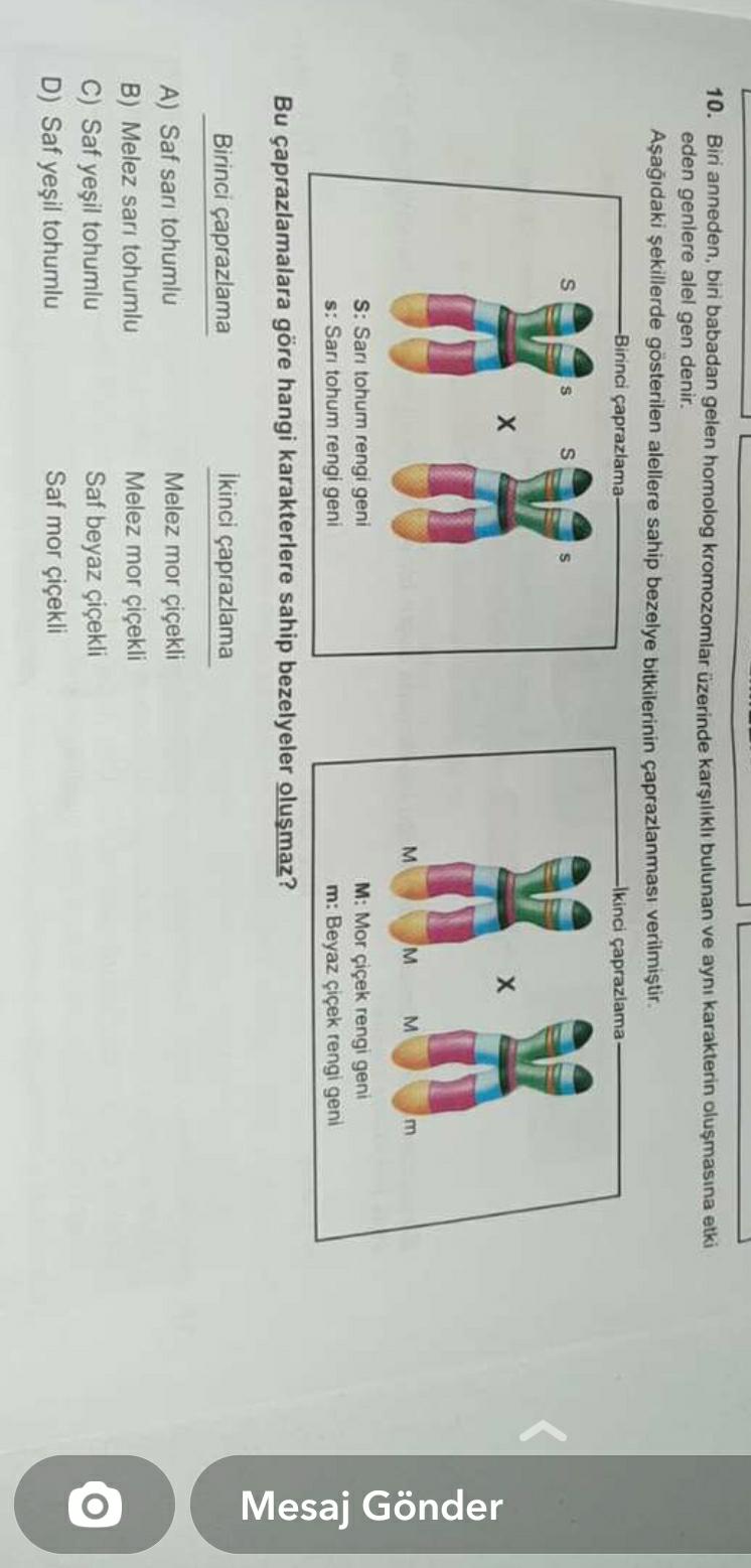 10. Biri anneden, biri babadan gelen homolog kromozomlar üzerinde karşılıklı bulunan ve aynı karakterin oluşmasına etki eden genlere alel gen denir. Aşağıdaki şekillerde gösterilen alellere sahip bezelye bitkilerinin çaprazlanması verilmiştir. -Birinci çaprazlama- -Ikinci çaprazlama s s S X MN M M M m S: Sarı tohum rengi geni M: Mor çiçek rengi geni s: Sari tohum rengi geni m: Beyaz çiçek rengi geni Bu çaprazlamalara göre hangi karakterlere sahip bezelyeler oluşmaz? Mesaj Gönder Birinci çaprazlama ikinci çaprazlama A) Saf sarı tohumlu B) Melez sarı tohumlu C) Saf yeşil tohumlu D) Saf yeşil tohumlu Melez mor çiçekli Melez mor çiçekli Saf beyaz çiçekli Saf mor çiçekli
