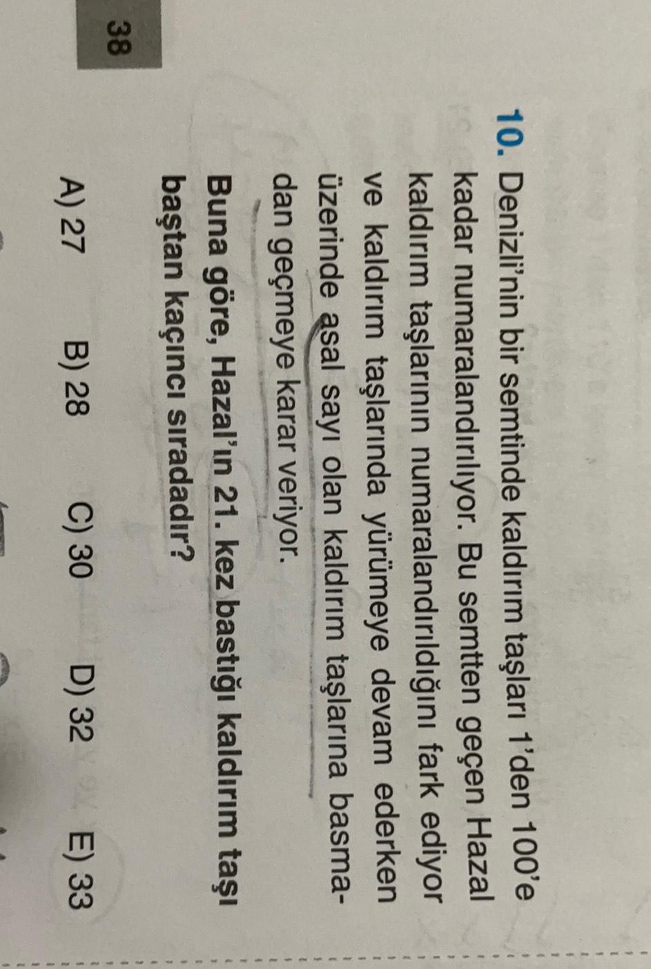 10. Denizli'nin bir semtinde kaldırım taşları 1'den 100'e kadar numaralandırılıyor. Bu semtten geçen Hazal kaldırım taşlarının numaralandırıldığını fark ediyor ve kaldırım taşlarında yürümeye devam ederken üzerinde asal sayı olan kaldırım taşlarına basma- dan geçmeye karar veriyor. Buna göre, Hazal'ın 21. kez bastığı kaldırım taşı baştan kaçıncı sıradadır? 1 1 38 7 A) 27 C) 30 B) 28 5 D) 32 E) 33