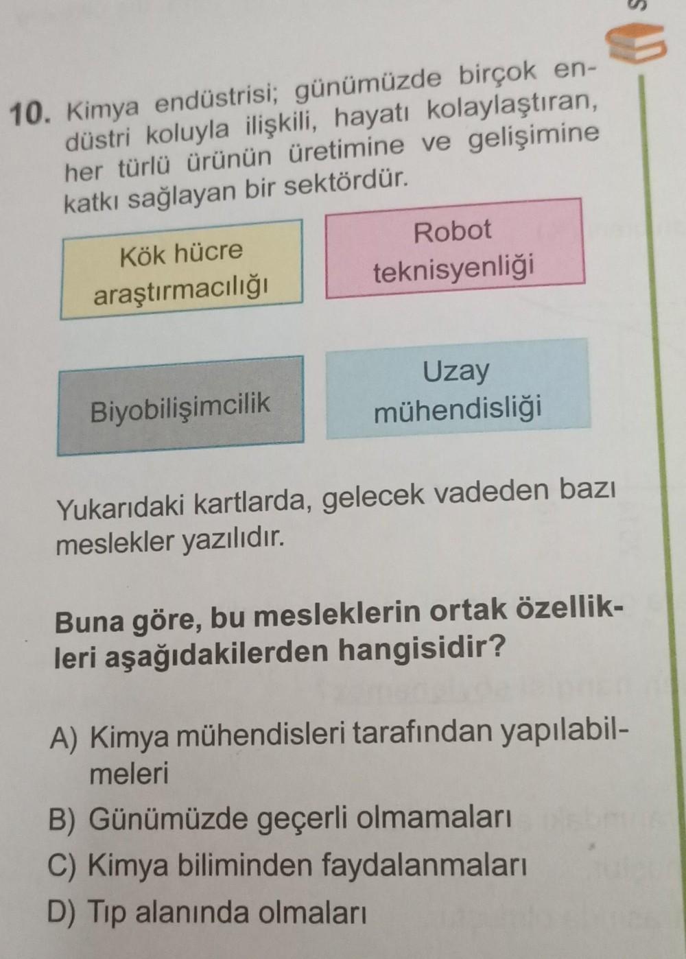 10. Kimya endüstrisi; günümüzde birçok en- düstri koluyla ilişkili, hayatı kolaylaştıran, her türlü ürünün üretimine ve gelişimine katkı sağlayan bir sektördür. Kök hücre araştırmacılığı Robot teknisyenliği Uzay mühendisliği Biyobilişimcilik Yukarıdaki kartlarda, gelecek vadeden bazı meslekler yazılıdır. Buna göre, bu mesleklerin ortak özellik- leri aşağıdakilerden hangisidir? A) Kimya mühendisleri tarafından yapılabil- meleri B) Günümüzde geçerli olmamaları C) Kimya biliminden faydalanmaları D) Tip alanında olmaları