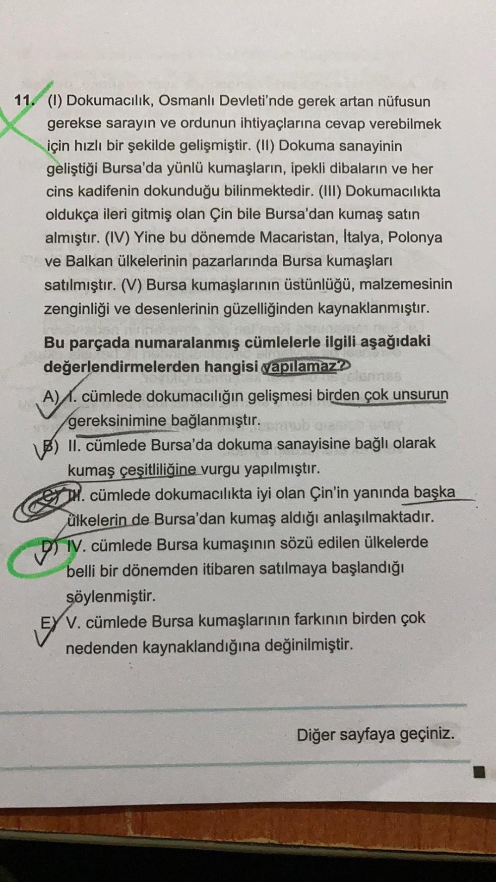 11. (1) Dokumacılık, Osmanlı Devleti'nde gerek artan nüfusun gerekse sarayın ve ordunun ihtiyaçlarına cevap verebilmek için hızlı bir şekilde gelişmiştir. (II) Dokuma sanayinin geliştiği Bursa'da yünlü kumaşların, ipekli dibaların ve her cins kadifenin dokunduğu bilinmektedir. (III) Dokumacılıkta oldukça ileri gitmiş olan Çin bile Bursa'dan kumaş satın almıştır. (IV) Yine bu dönemde Macaristan, Italya, Polonya ve Balkan ülkelerinin pazarlarında Bursa kumaşları satılmıştır. (V) Bursa kumaşlarının üstünlüğü, malzemesinin zenginliği ve desenlerinin güzelliğinden kaynaklanmıştır. Bu parçada numaralanmış cümlelerle ilgili aşağıdaki değerlendirmelerden hangisi qapılamaz? A) 1. cümlede dokumacılığın gelişmesi birden çok unsurun gereksinimine bağlanmıştır. B) II. cümlede Bursa'da dokuma sanayisine bağlı olarak kumaş çeşitliliğine vurgu yapılmıştır. Dr. cümlede dokumacılıkta iyi olan Çin'in yanında başka ülkelerin de Bursa'dan kumaş aldığı anlaşılmaktadır. IV. cümlede Bursa kumaşının sözü edilen ülkelerde belli bir dönemden itibaren satılmaya başlandığı söylenmiştir. EY V. cümlede Bursa kumaşlarının farkının birden çok nedenden kaynaklandığına değinilmiştir. Diğer sayfaya geçiniz.