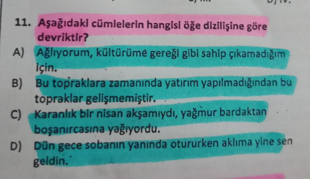 11. Aşağıdaki cümlelerin hangisi öğe dizilişine göre devriktir? A) Ağlıyorum, kültürüme gereği gibi sahip çıkamadığım için, B) Bu topraklara zamanında yatırım yapılmadığından bu topraklar gelişmemiştir. C) Karanlık bir nisan akşamıydı, yağmur bardaktan boşanırcasına yağıyordu. D) Dün gece sobanın yanında otururken aklıma yine sen geldin.