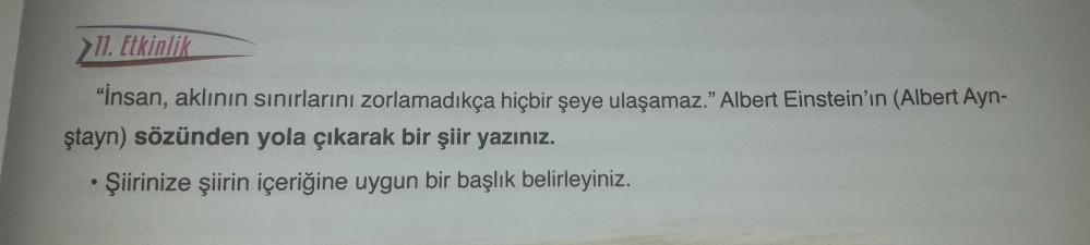 11. Etkinlik "Insan, aklının sınırlarını zorlamadıkça hiçbir şeye ulaşamaz.” Albert Einstein'ın (Albert Ayn- ştayn) sözünden yola çıkarak bir şiir yazınız. Şiirinize şiirin içeriğine uygun bir başlık belirleyiniz.