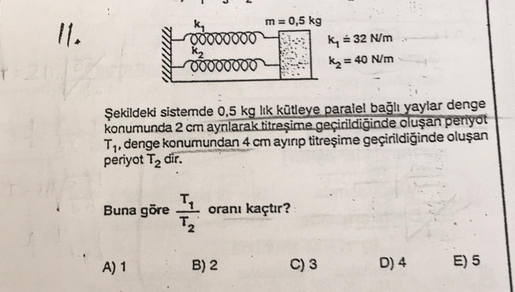 11. m = 0,5 kg 00000000 kg = 32 N/m k₂ 00000000 Ky = 40 Nm Şekildeki sistemde 0,5 kg lik kütleye paralel bağlı yaylar denge konumunda 2 cm aynlarak titreşime geçirildiğinde oluşan periyot T7, denge konumundan 4 cm ayınp titreşime geçirildiğinde oluşan periyot T2 dir. Buna göre T T2 oranı kaçtır? A) 1 B) 2 C) 3 D) 4 E) 5