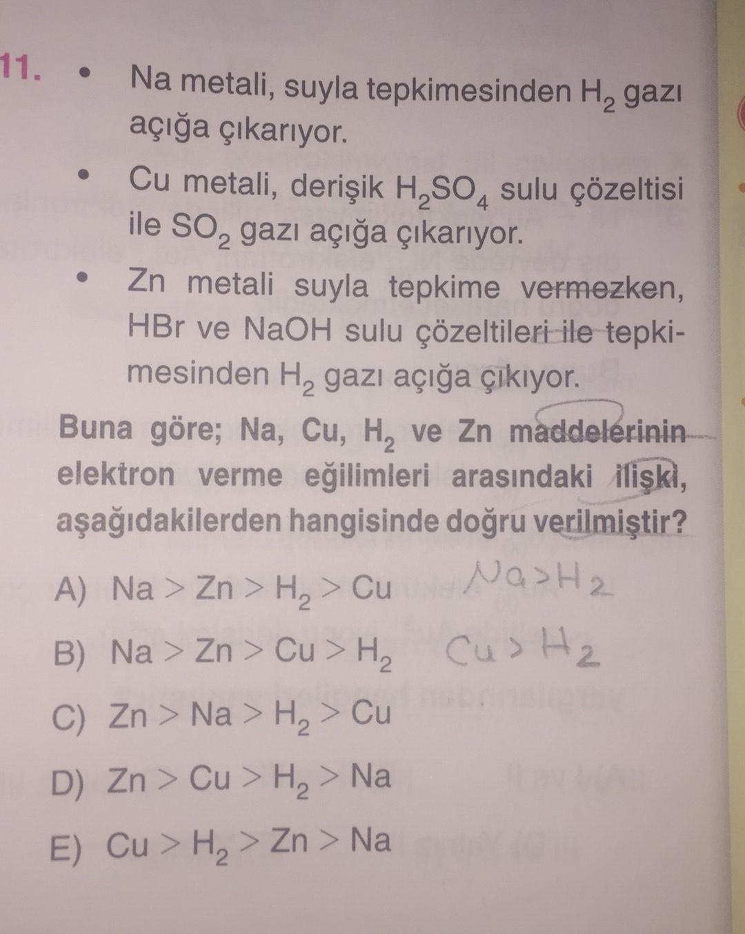 11. • Na metali, suyla tepkimesinden H, gazı açığa çıkarıyor. Cu metali, derişik H2SO4 sulu çözeltisi ile SO2 gazi açığa çıkarıyor. Zn metali suyla tepkime vermezken, HBr ve NaOH sulu çözeltileri ile tepki- mesinden Hą gazı açığa çıkıyor. Buna göre; Na, Cu, H, ve Zn maddelerinin elektron verme eğilimleri arasındaki ilişki, aşağıdakilerden hangisinde doğru verilmiştir? A) Na > Zn > H, > Cu Nasha B) Na > Zn > Cu > H, cu> H2 > C) Zn > Na > H, > Cu D) Zn > Cu > H, > Na E) Cu > Hy > Zn > Na >