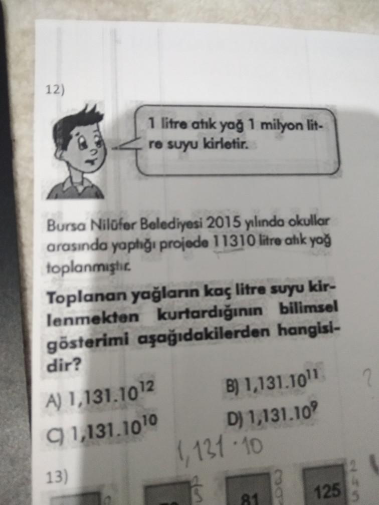 12) 1 litre atık yağ 1 milyon lit- re suyu kirletir. Bursa Nilüfer Belediyesi 2015 yılında okullar arasında yaptığı projede 11310 litre atık yağ toplanmiştic Toplanan yağların kaç litre suyu kir- lenmekten kurtardığının bilimsel gösterimi aşağıdakilerden hangisi- dir? A) 1,131.1012 91,131.1010 13) B) 1,131.10¹1 D) 1,131.109 1,131-10 81 125 2